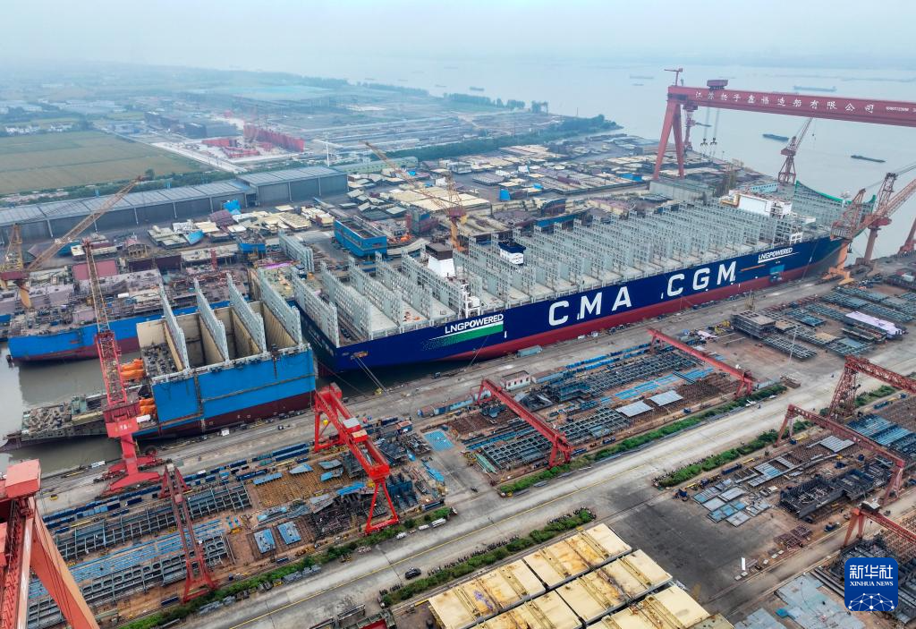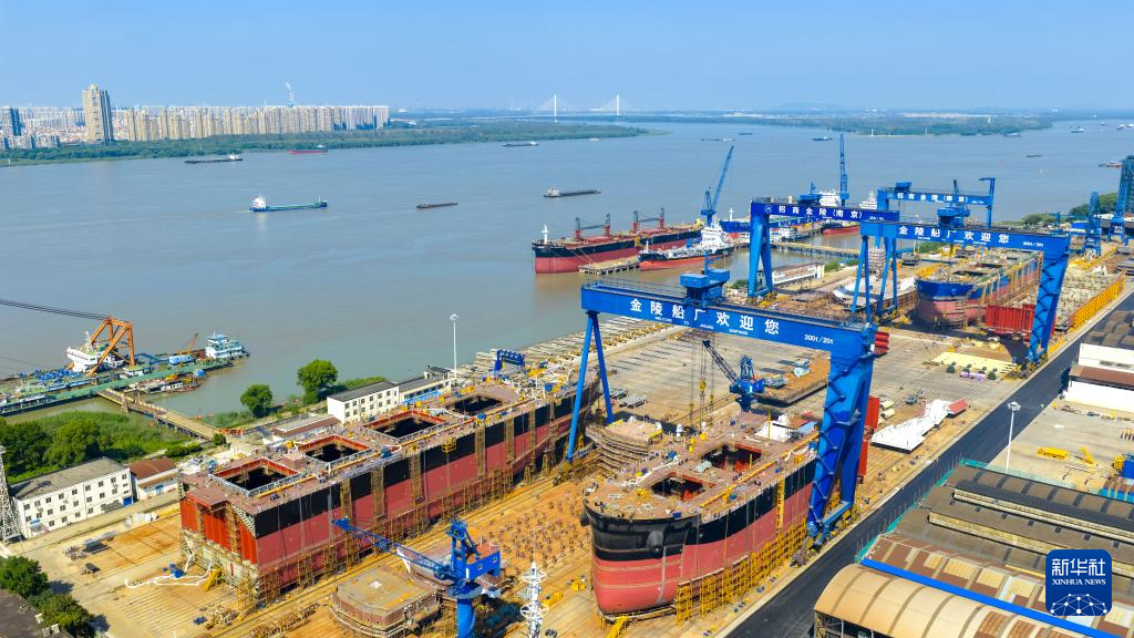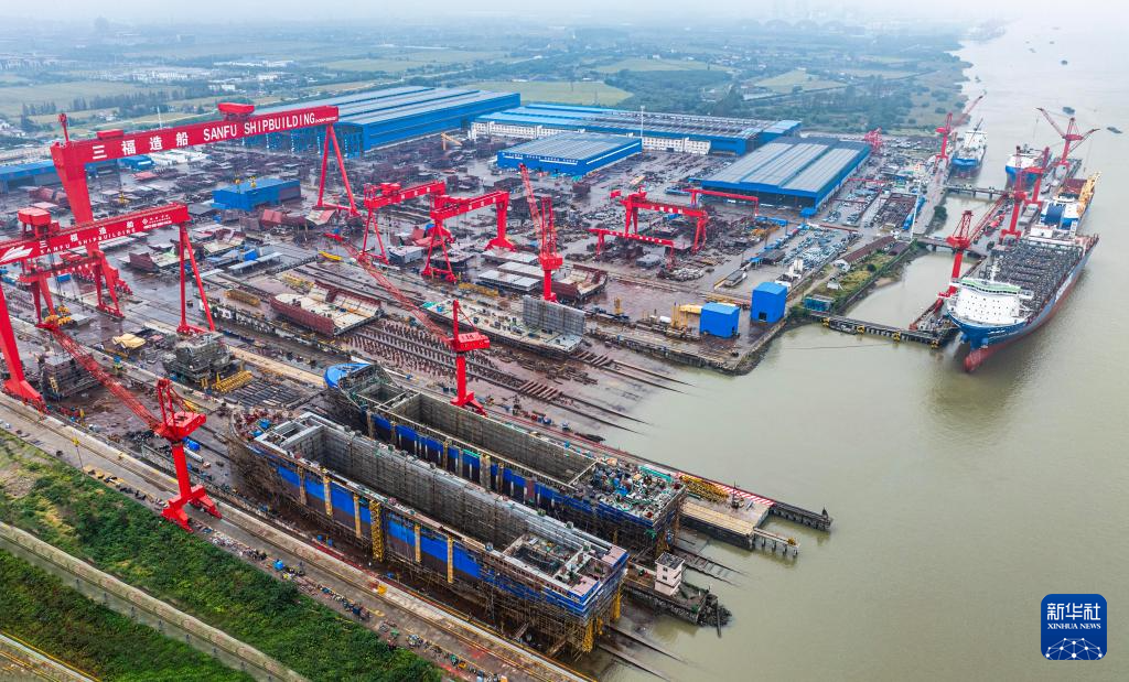 10月14日,在位于江蘇省泰州市高港區的泰州三福船舶工程有限公司生產基地,多艘大型船舶正在建造中(無人機照片)。