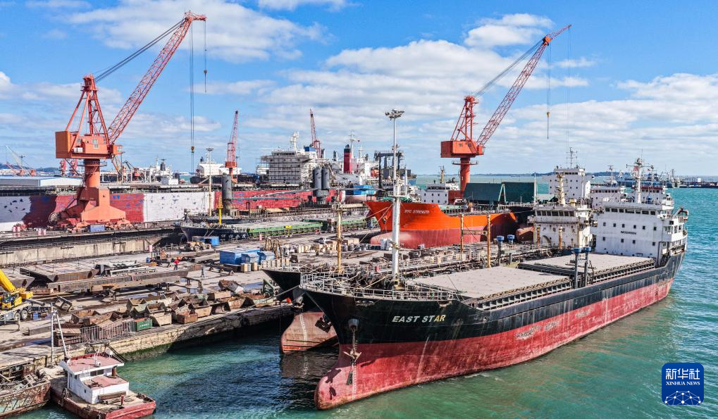 10月14日,在山東省榮成市石島管理區修造船產業基地,工人們在加緊工作(無人機照片)。