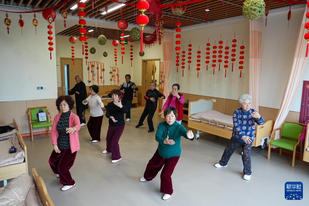 10月23日,老人們在淄博市張店區馬尚街道金石社區日間護理中心打太極拳。