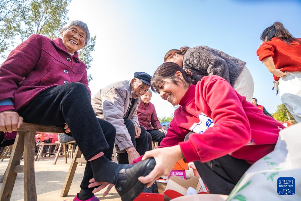 10月28日,在河南省駐馬店市西平縣師靈鎮白廟村,27位八旬長者獲贈愛心鞋。這是村婦聯工作人員為90歲的孫河信老人穿上愛心鞋。
