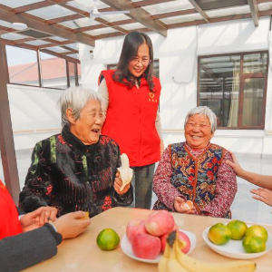 10月28日,在河南省洛陽市汝陽縣城關鎮東森養老院,青年志愿者為老人送蛋糕。