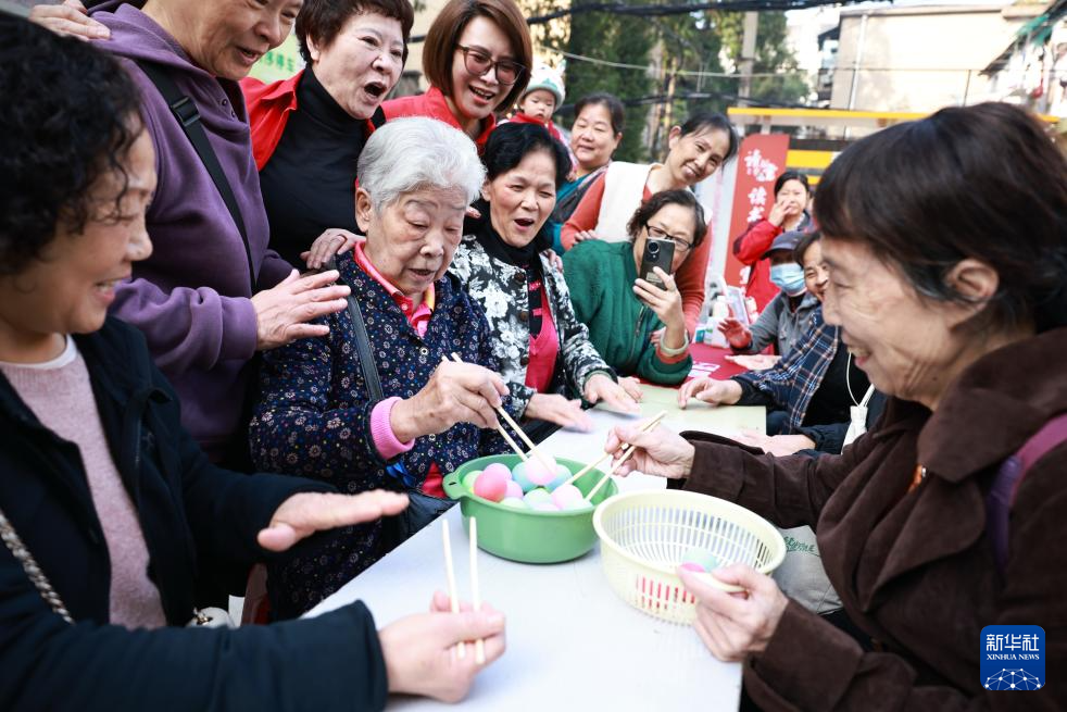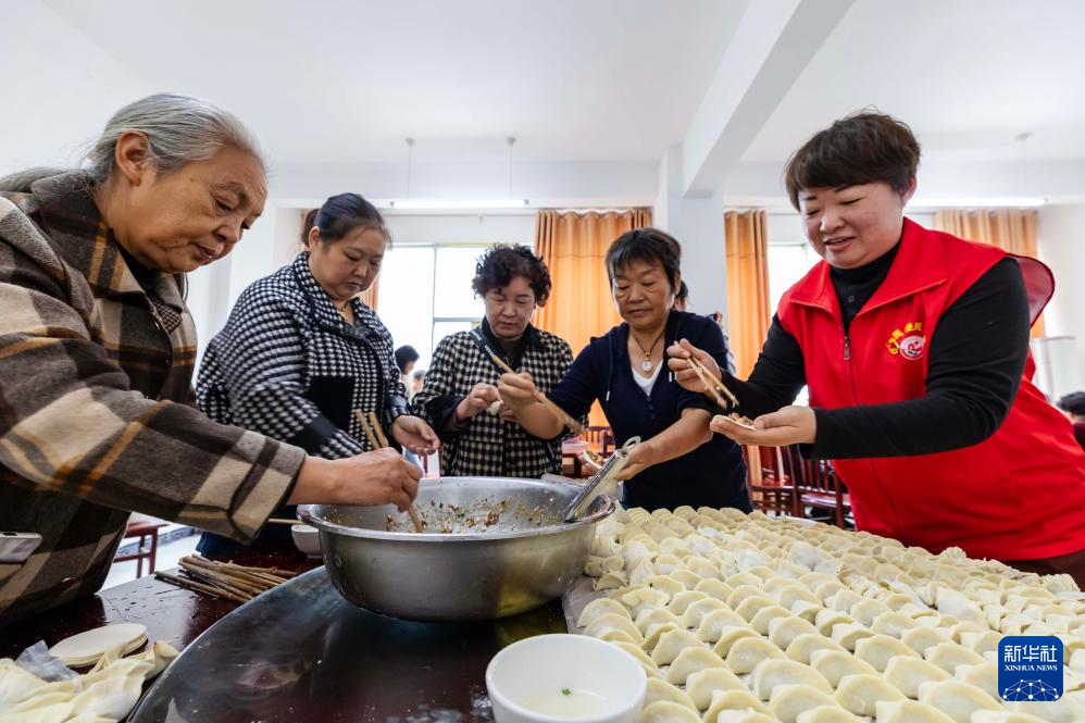10月28日,在貴州省黔西市杜鵑街道育才社區,志愿者和老人一起包餃子喜迎重陽節。