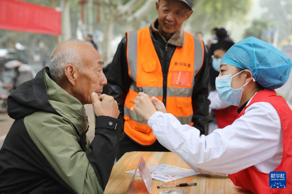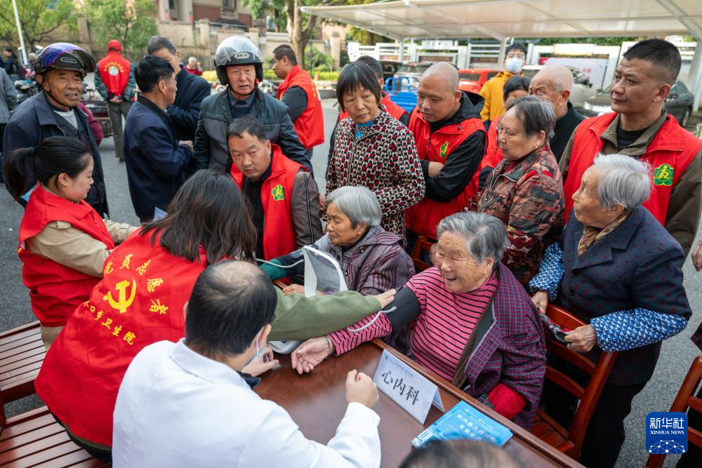 10月28日,在浙江省湖州市長興縣水口鄉水口村,醫護人員和志愿者為老人提供健康服務。