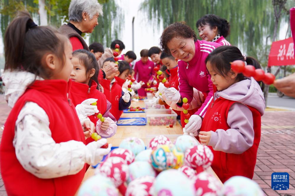 10月28日,河南省沁陽市第一幼兒園的孩子們與老人一起動手制作甜品。