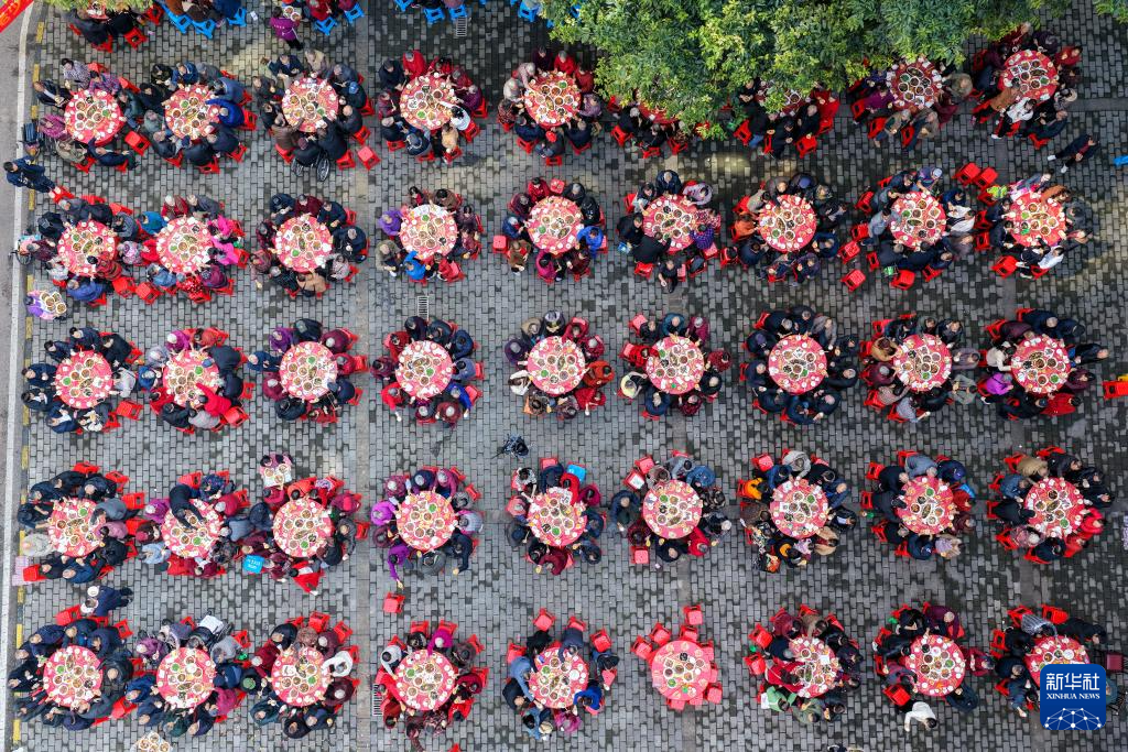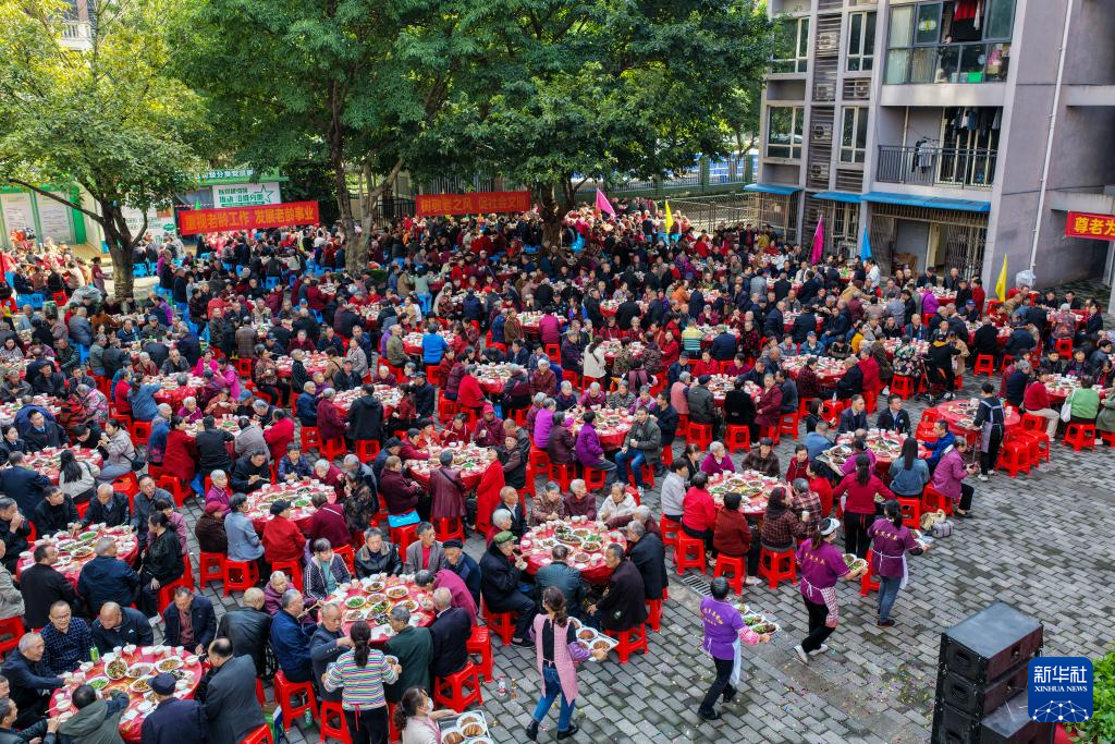10月28日,重慶市九龍坡區華巖鎮石龍社區開展“九九重陽節 濃濃百家情”主題活動,老人們在“長壽宴”活動現場用餐(無人機照片)。