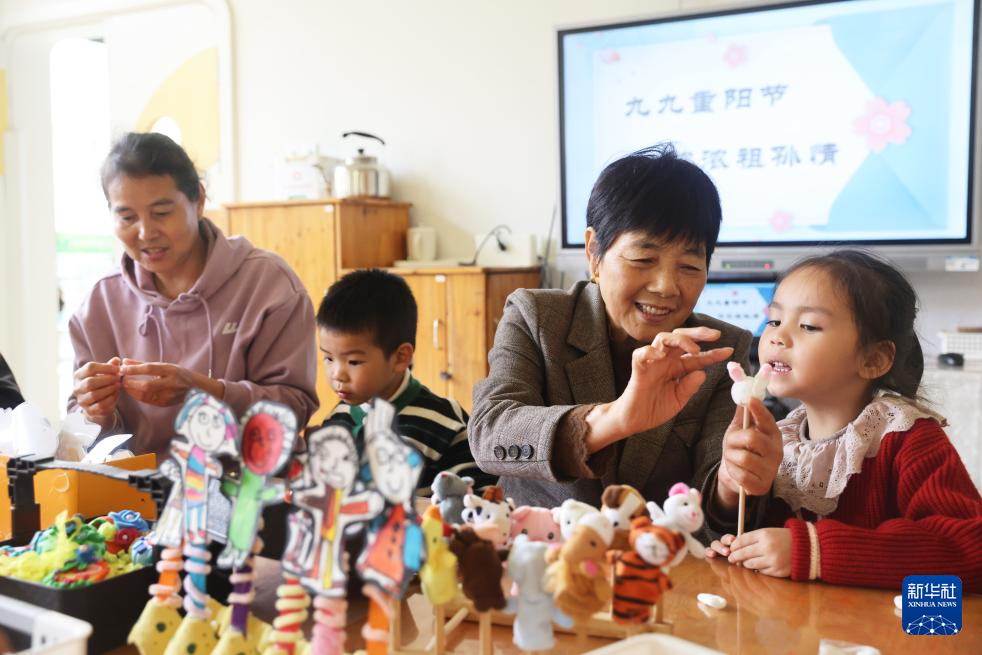 10月28日,在浙江省湖州市德清縣乾元鎮第一幼兒園,孩子們和老人一起制作戲偶。