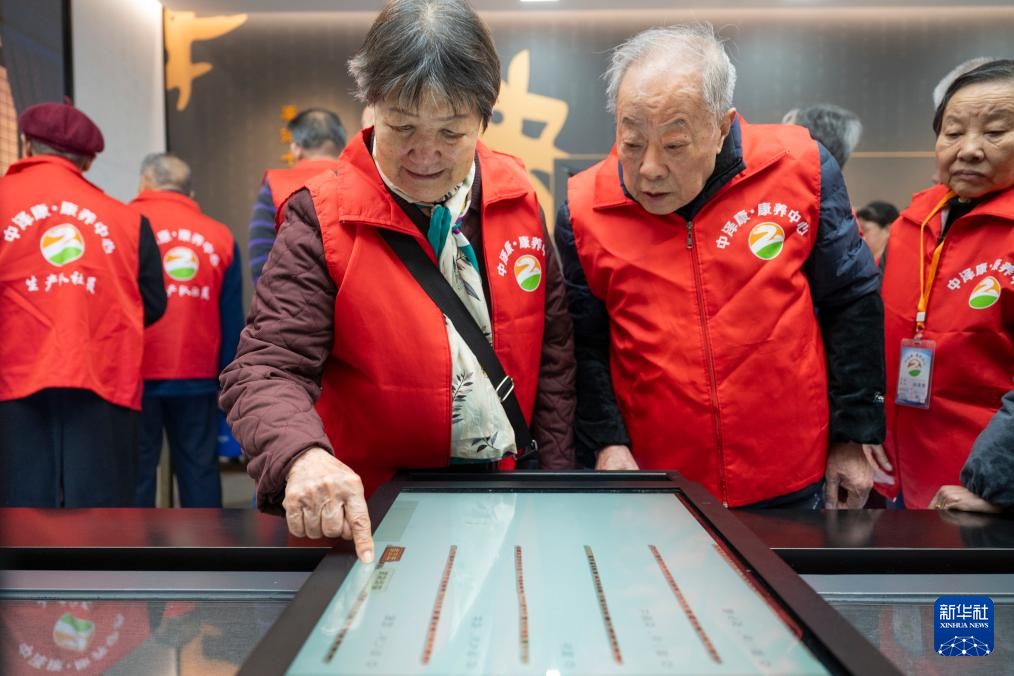 10月27日,湖北省孝感市一家康養中心的老人在云夢縣博物館使用互動屏參觀睡虎地秦簡。