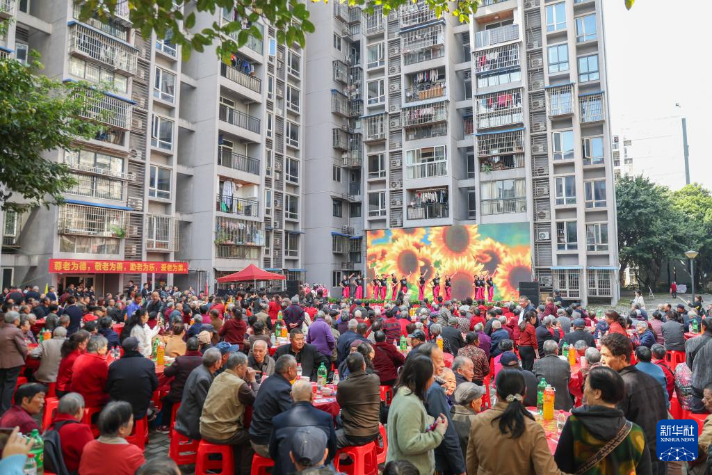 10月28日,重慶市九龍坡區華巖鎮石龍社區開展“九九重陽節 濃濃百家情”主題活動,老人們在“長壽宴”開始前觀看演出。