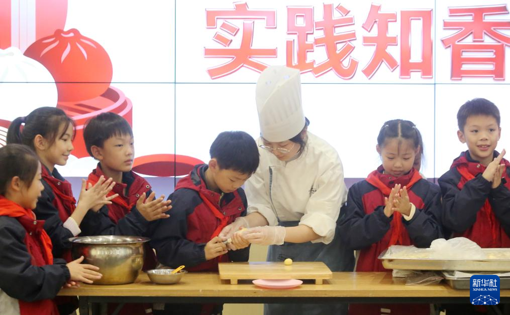 10月28日,在位于江蘇揚州的中國淮揚菜博物館,糕點師指導小學生制作重陽糕。