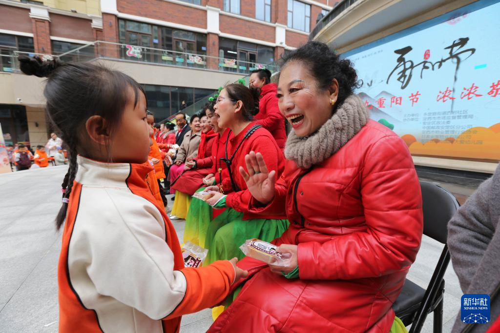 10月28日,小朋友和社區老人在甘肅省定西市安定區永定路街道舉辦的重陽節主題活動中互動。