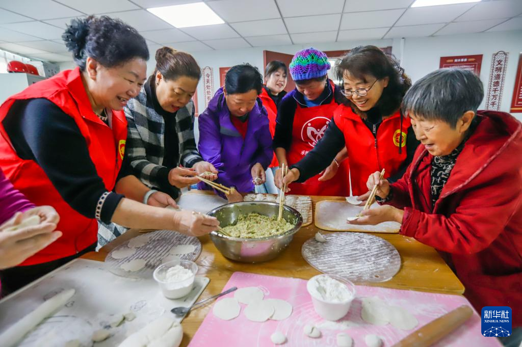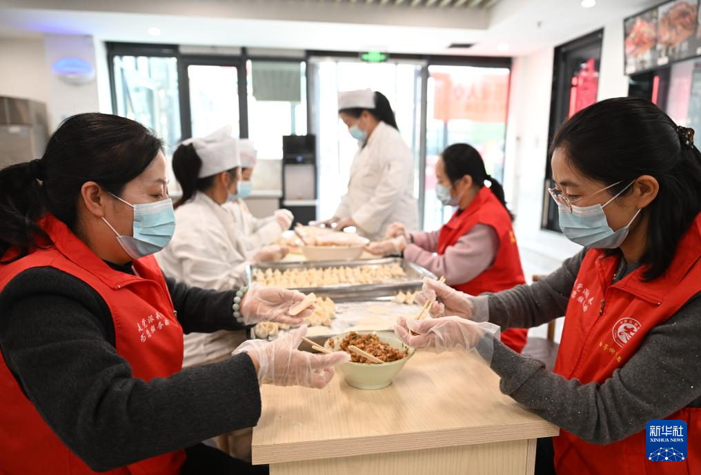 10月29日,志愿者在河北省承德市高新技術產業開發區濱河社區和老人一起包餃子。
