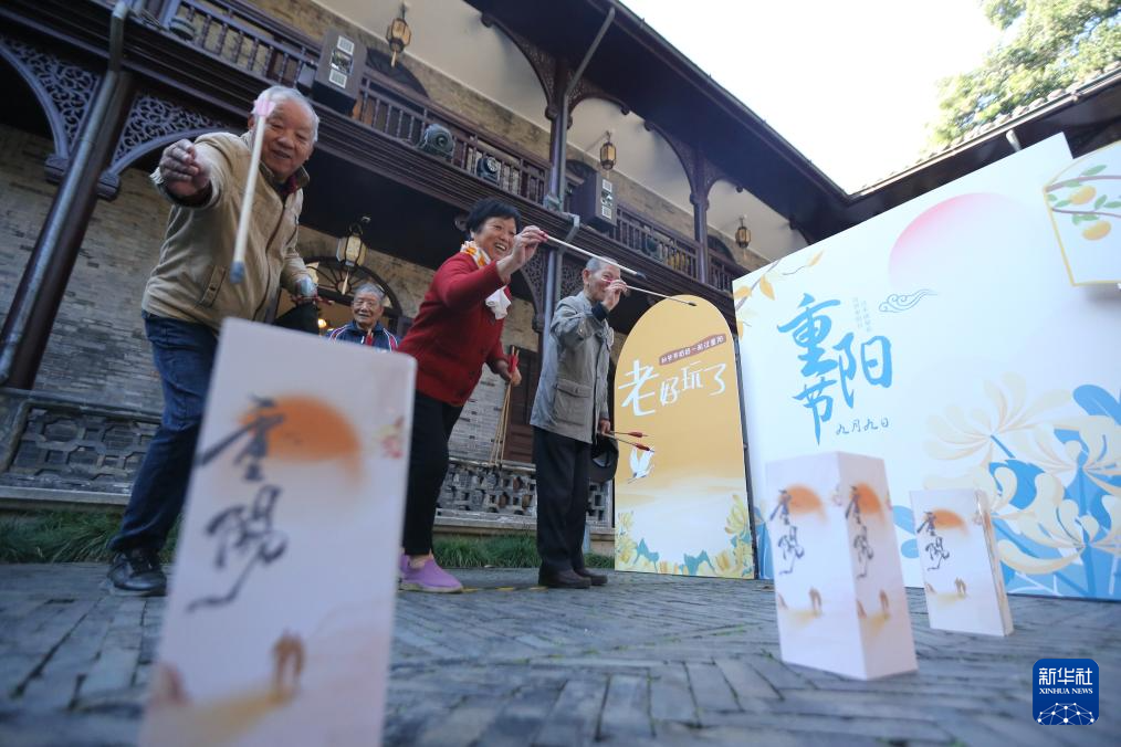 10月29日,在江蘇省揚州市何園景區,老年游客們在體驗投壺游戲。