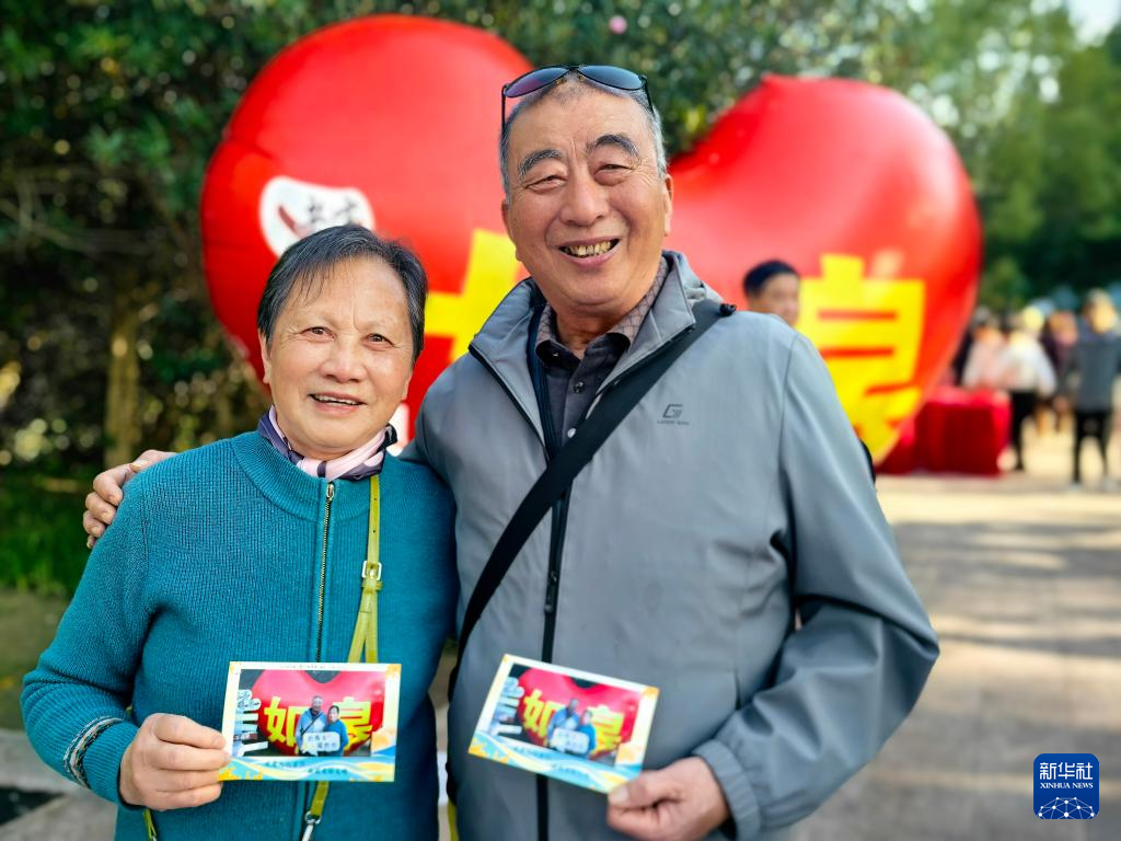 10月29日,在“我們的節日·重陽”主題文化活動江蘇如皋主會場,78歲的李杰(右)和老伴展示免費領取的合影照片。