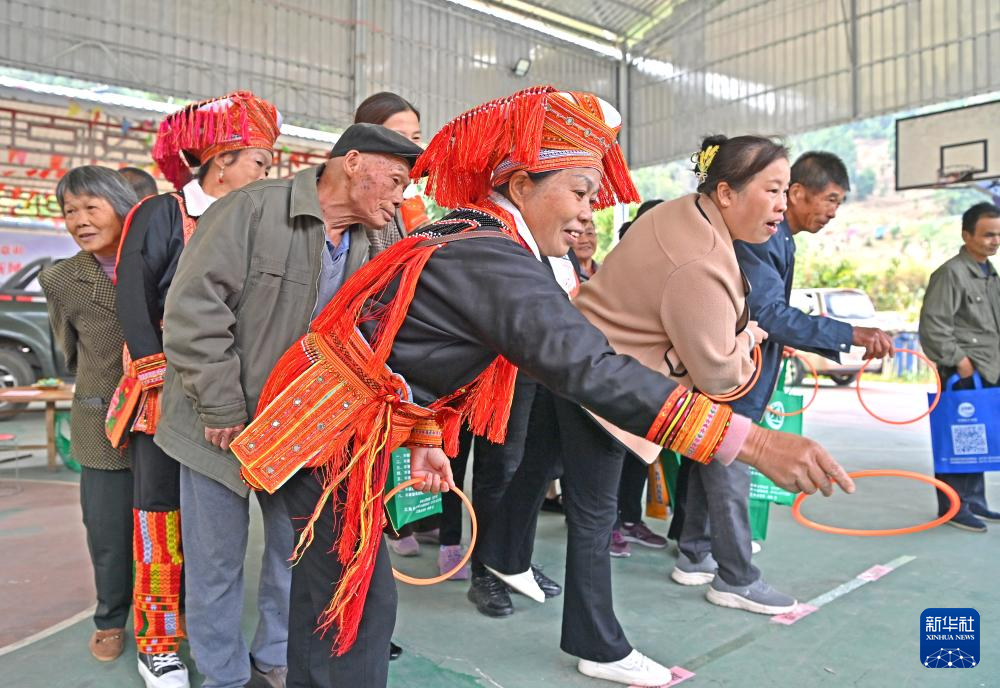 10月29日,人們在廣西金秀瑤族自治縣三角鄉六定村參加重陽節游園活動。