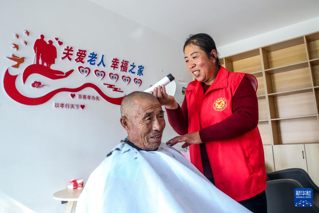 10月29日,志愿者在蘭州市榆中縣小康營鄉郭家營村互助幸福院理發室內為村民義務理發。