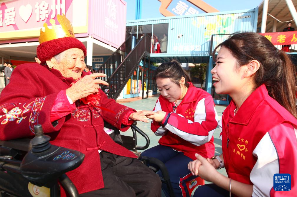 10月29日,江蘇徐州高等師范學校的大學生志愿者與銅山區三堡街道潘樓村的老人聊天,為老人修剪指甲。
