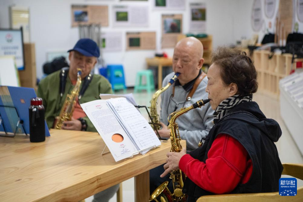 10月29日,在重慶市江北區五里店街道渝能陽光社區“享老驛站”,社區老年居民在重陽節活動上練習樂器。