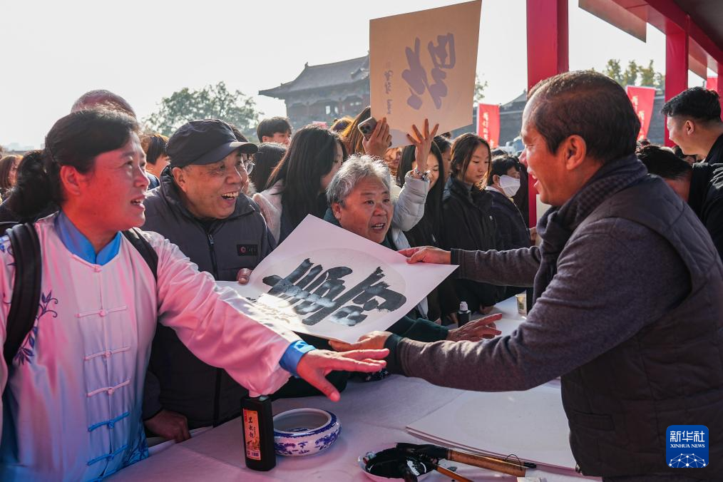 10月29日,在山東省泰安市舉行的2025年全國“我們的節日·重陽”主題文化活動泰安市示范活動現場,藝術工作者為老人創作書法作品。