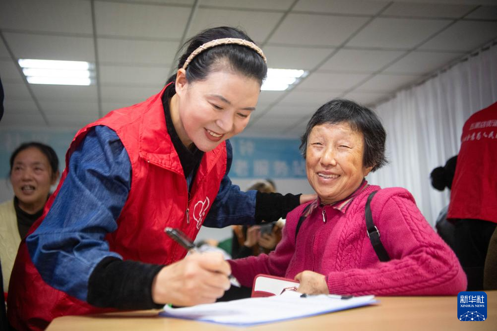 10月29日,在重慶市江北區五里店街道渝能陽光社區“享老驛站”,志愿者與老年居民交流并做健康信息記錄。