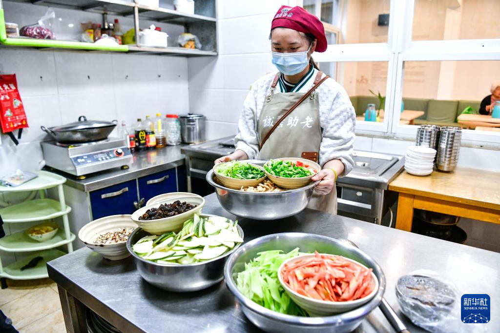 在貴陽市南明區紅巖東郡社區誠善助老公益互助服務點,銀發志愿者在給老人們準備午餐(10月24日攝)。