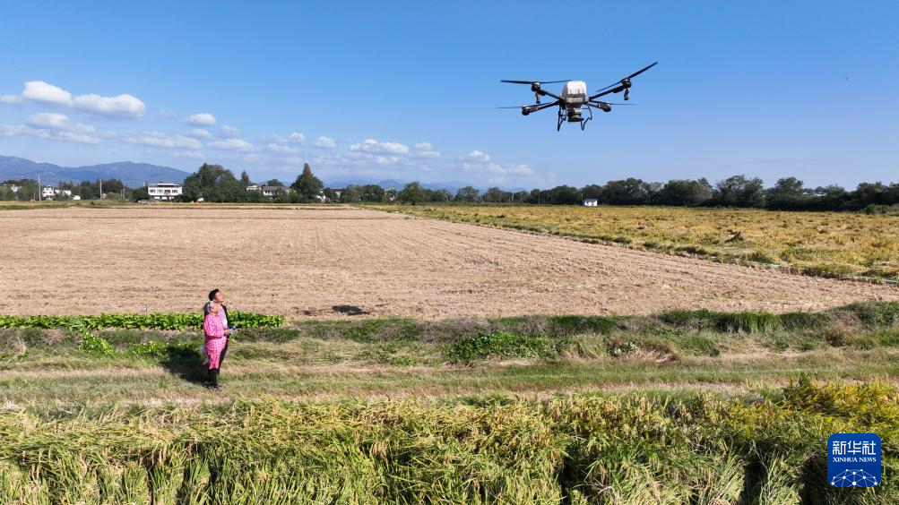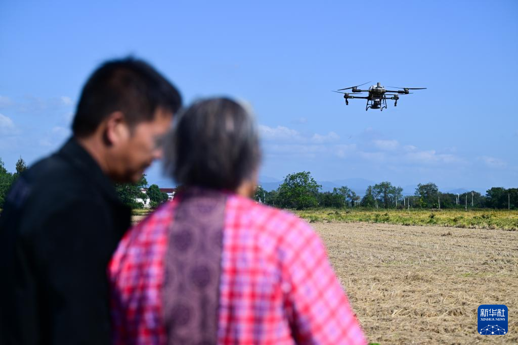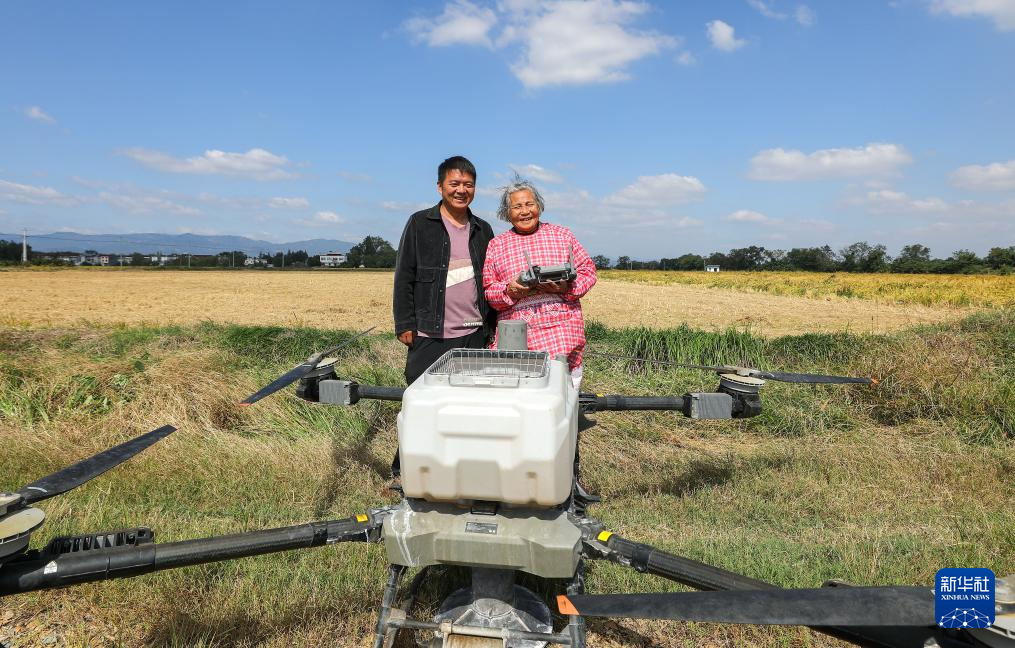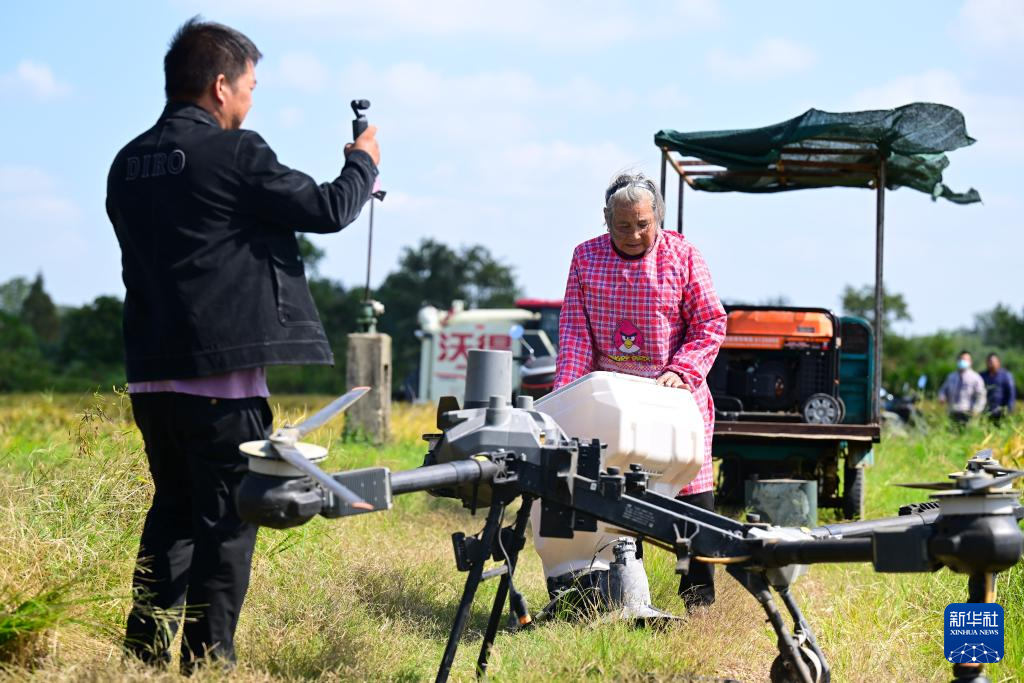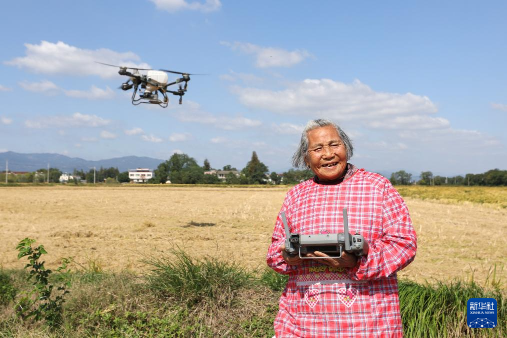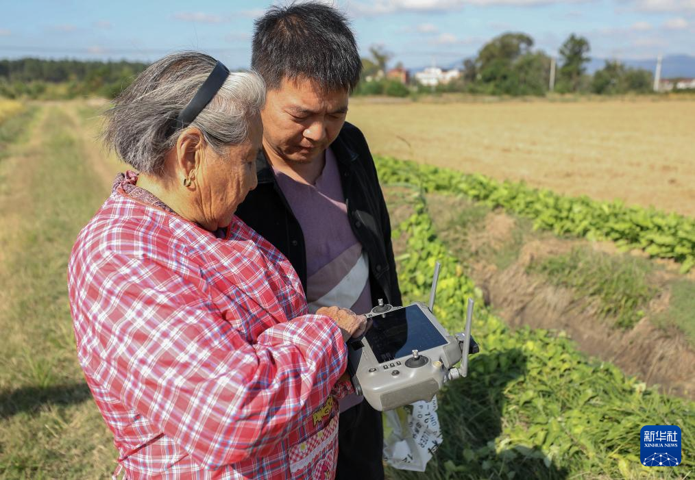在安徽省桐城市新渡鎮老梅村,空中的植保無人機給一片麥田施肥,田邊手拿遙控器的,竟是滿頭白發的老人——82歲的戴淑英,她的孫子王甜甜在一旁指導。