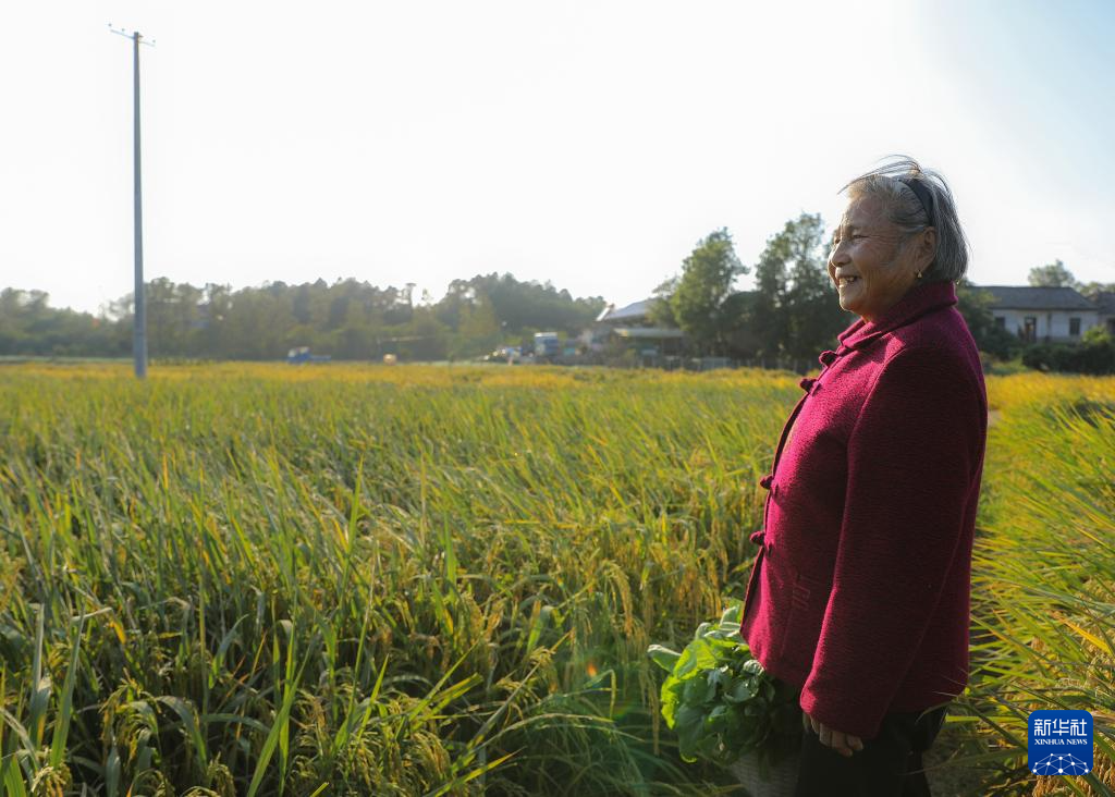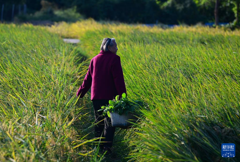 10月22日,戴淑英摘完菜后,望向遠處忙著收稻子的家人們。