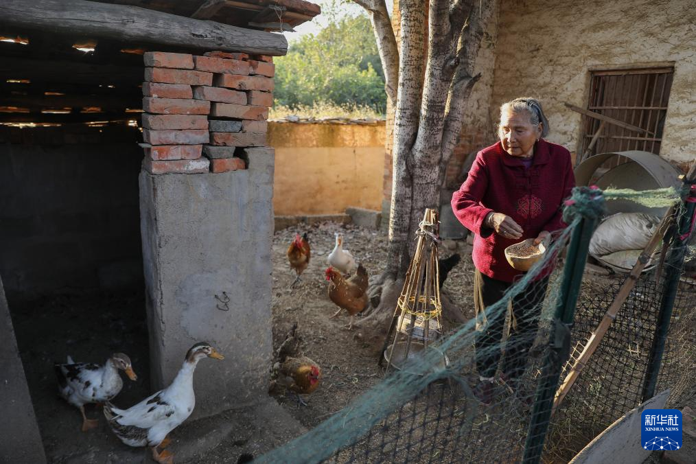 10月22日,戴淑英給家禽喂食。