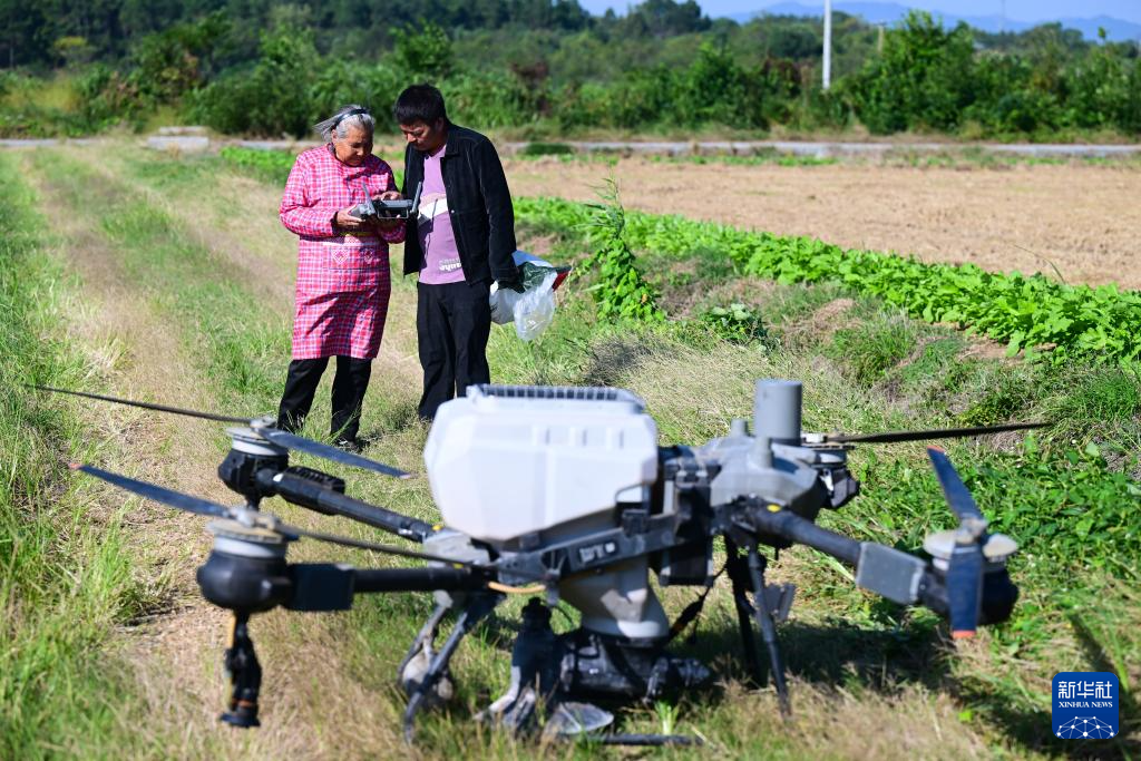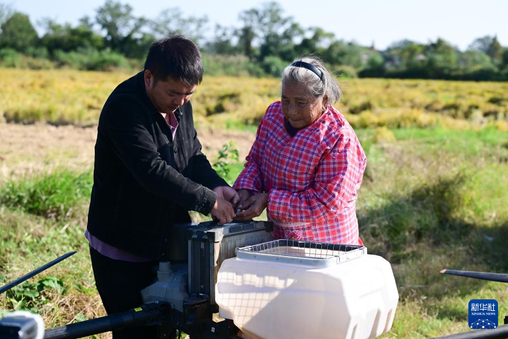 10月23日,戴淑英(左)在王甜甜的指導下操作植保無人機。