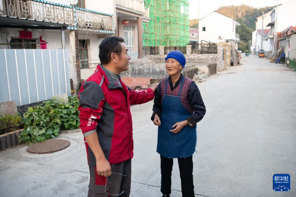 10月24日,在安徽省石臺縣,檀世旺與一位老人交流,提醒其注意道路安全。