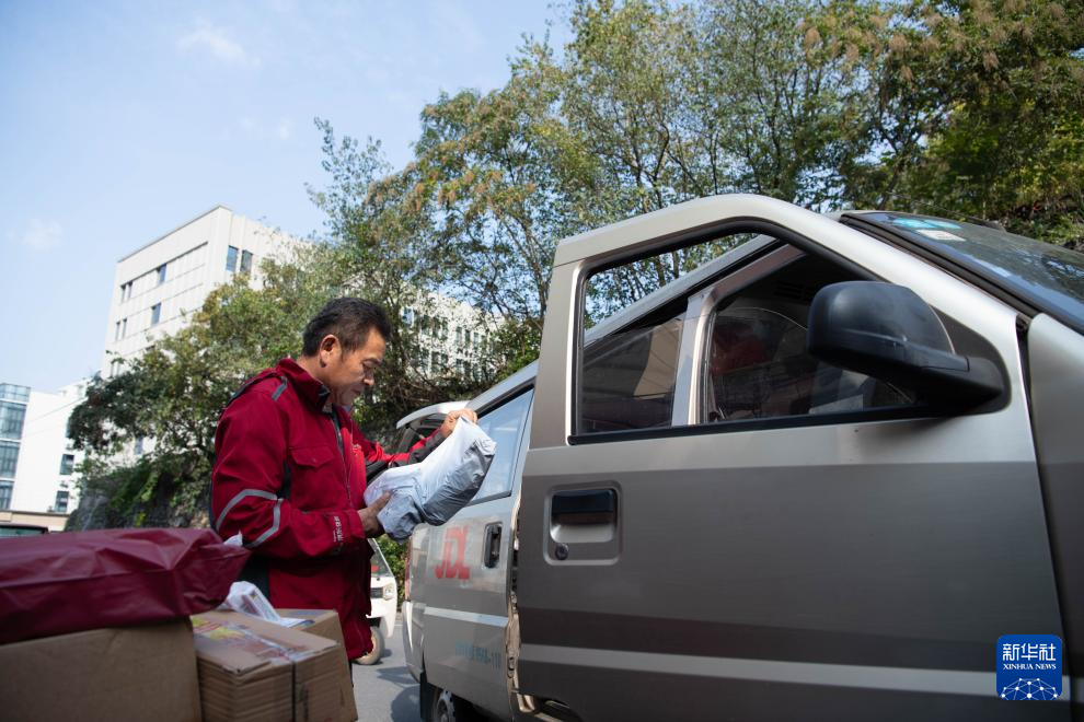 10月27日,在安徽省石臺縣城,檀世旺將快遞裝車準備送往鄉鎮。