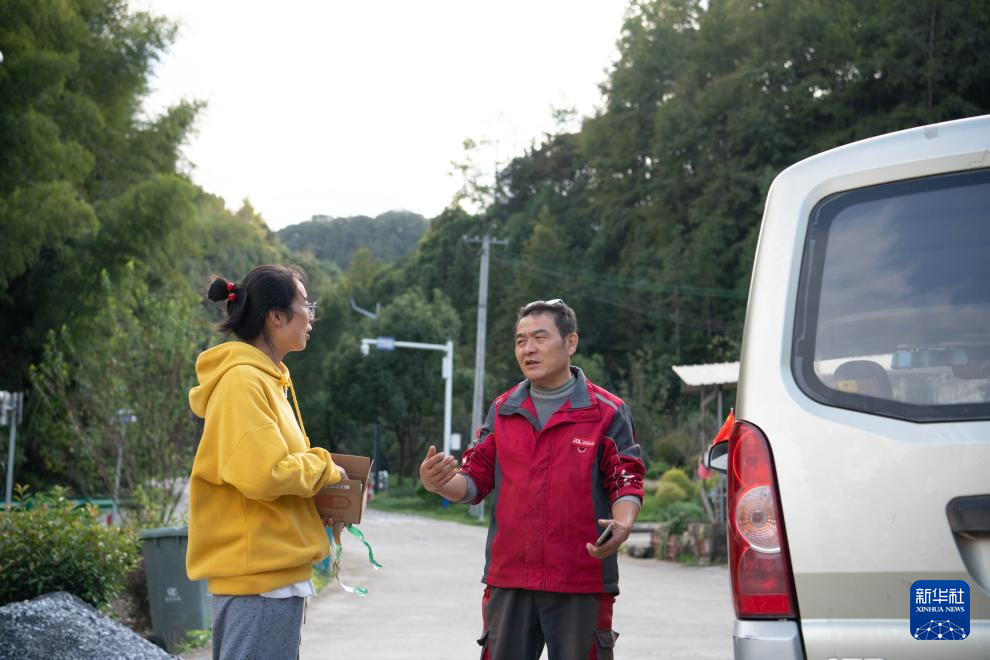 10月24日,在安徽省石臺縣,檀世旺送快遞時與村民交流。