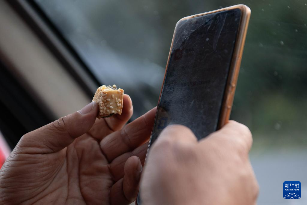 10月24日,在安徽省石臺縣,檀世旺送快遞途中顧不上吃午飯,吃點心充饑。