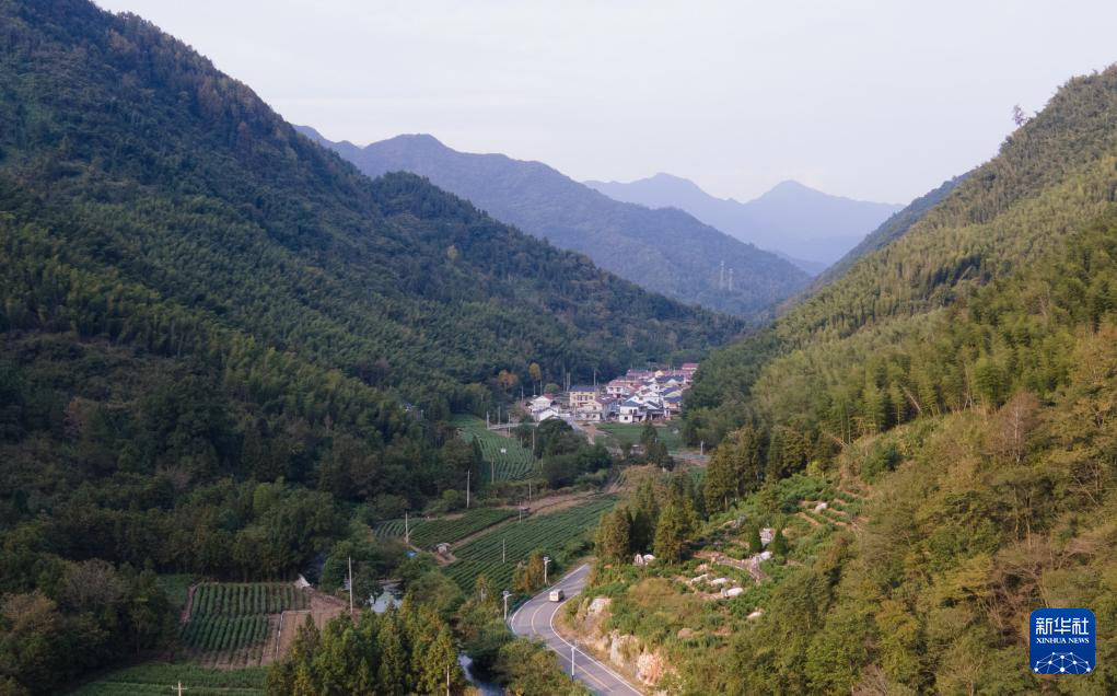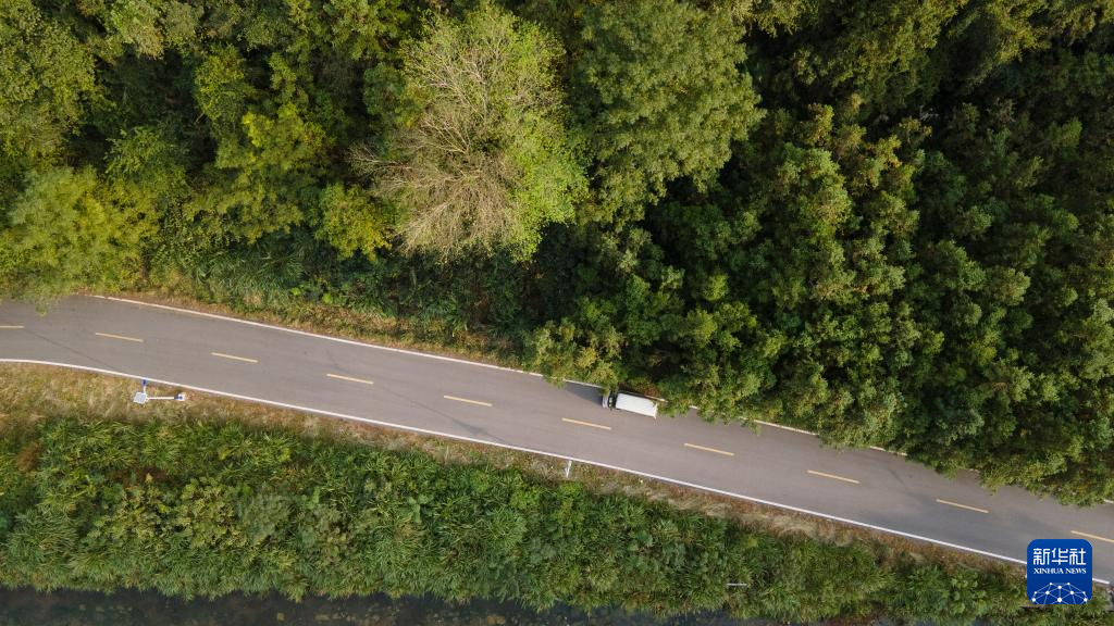10月27日,在安徽省石臺縣蓮花村,檀世旺駕駛面包車配送快遞(無人機照片)。