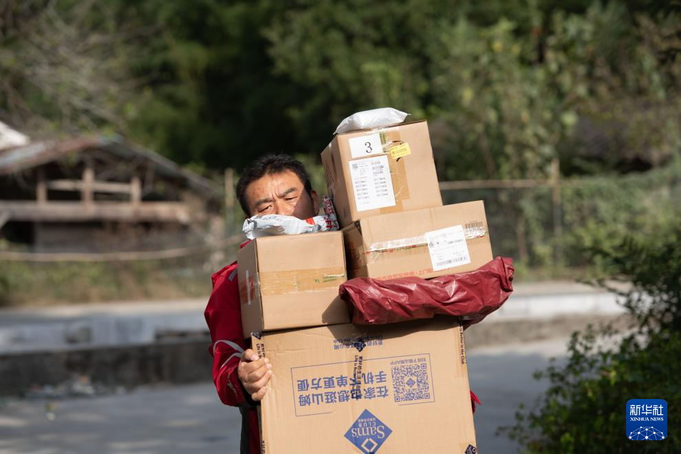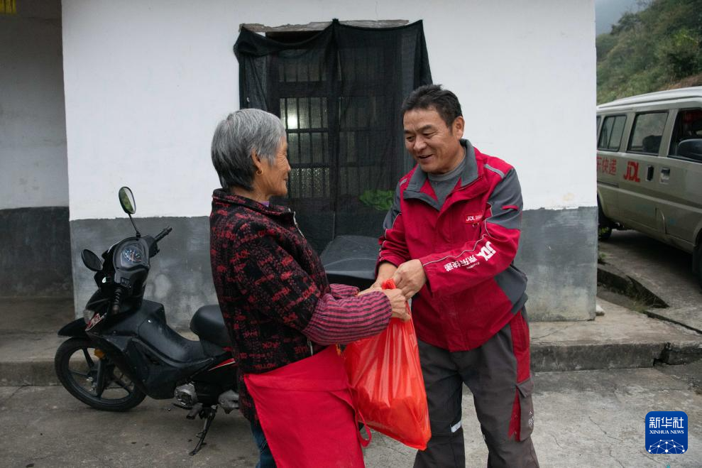 10月27日,在安徽省池州市石臺縣大演鄉,檀世旺給村民送快遞。