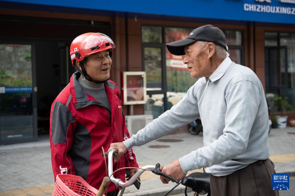 10月26日,在安徽省池州市石臺縣大演鄉,檀世旺配送快遞途中幫助一位老人推車。