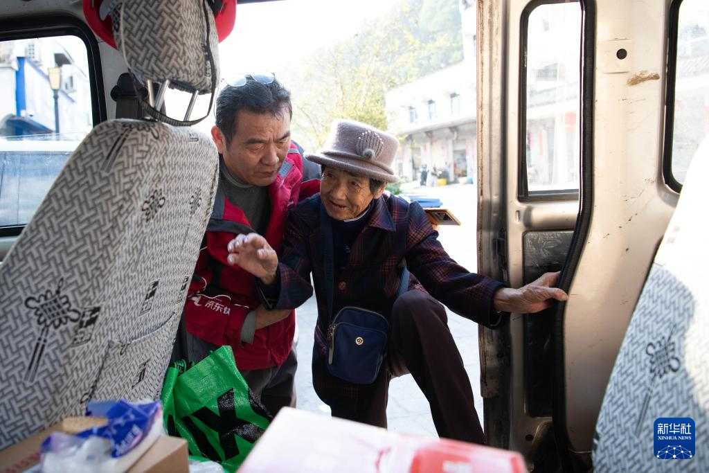 10月24日,在安徽省石臺縣,檀世旺配送快遞途中捎帶一位老人回家。