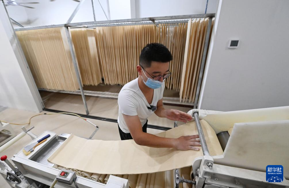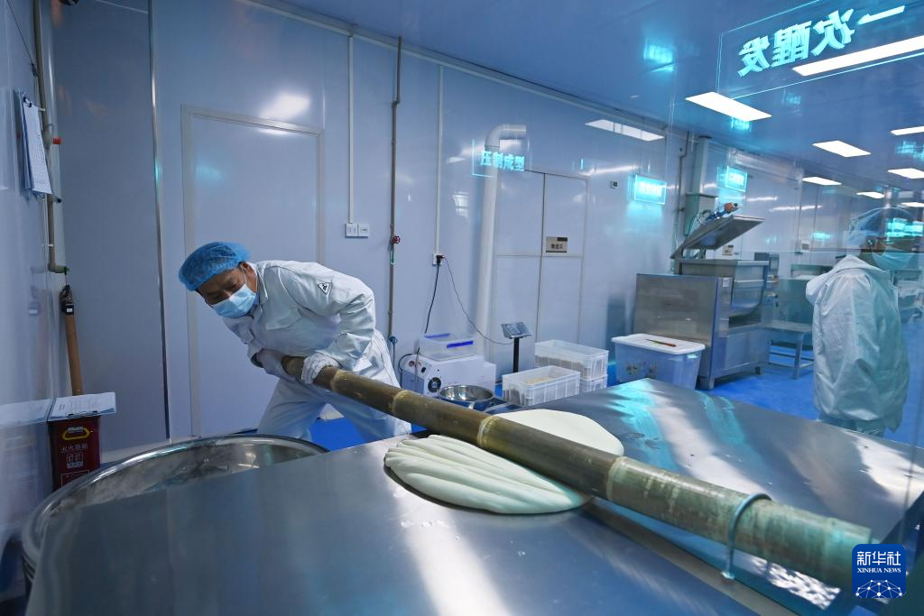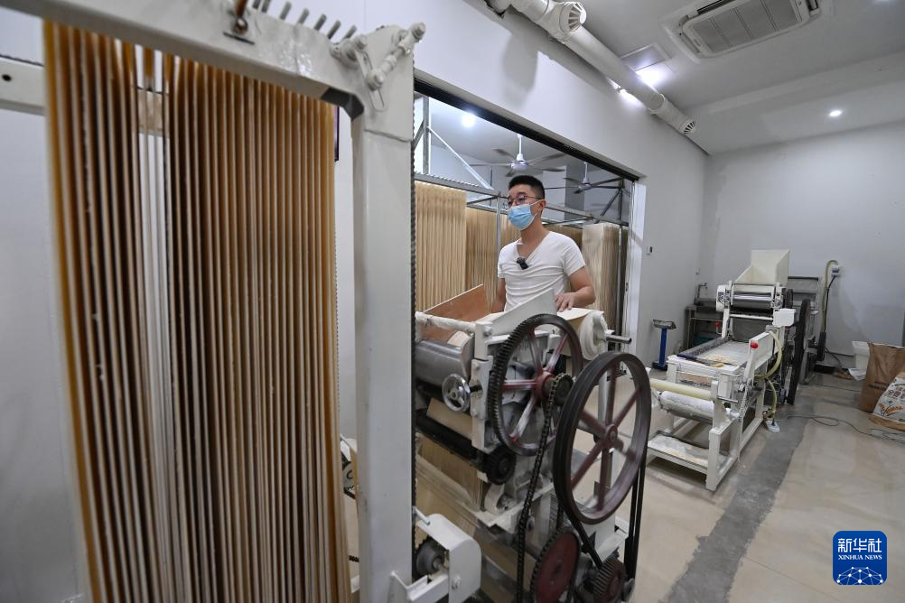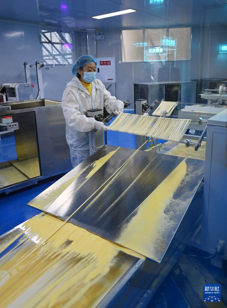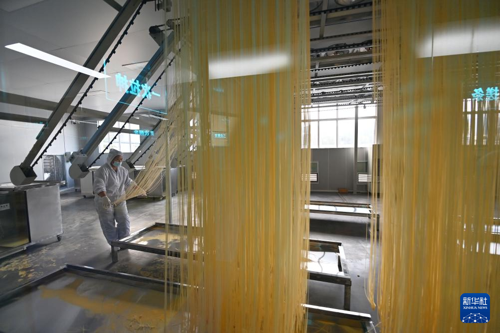 11月4日,在巴陽杠子面生產工廠,工作人員將面條“盤條上桿”。巴陽杠子面是重慶市云陽縣的傳統面食之一,發源于巴陽峽兩岸,以竹杠壓面工藝和獨特口感著稱。