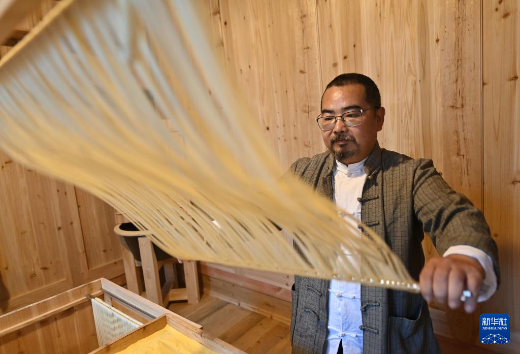 11月4日,在巴陽杠子面生產工廠,巴陽杠子面傳統制作技藝傳承人劉益在展示制作技藝。巴陽杠子面是重慶市云陽縣的傳統面食之一,發源于巴陽峽兩岸,以竹杠壓面工藝和獨特口感著稱。