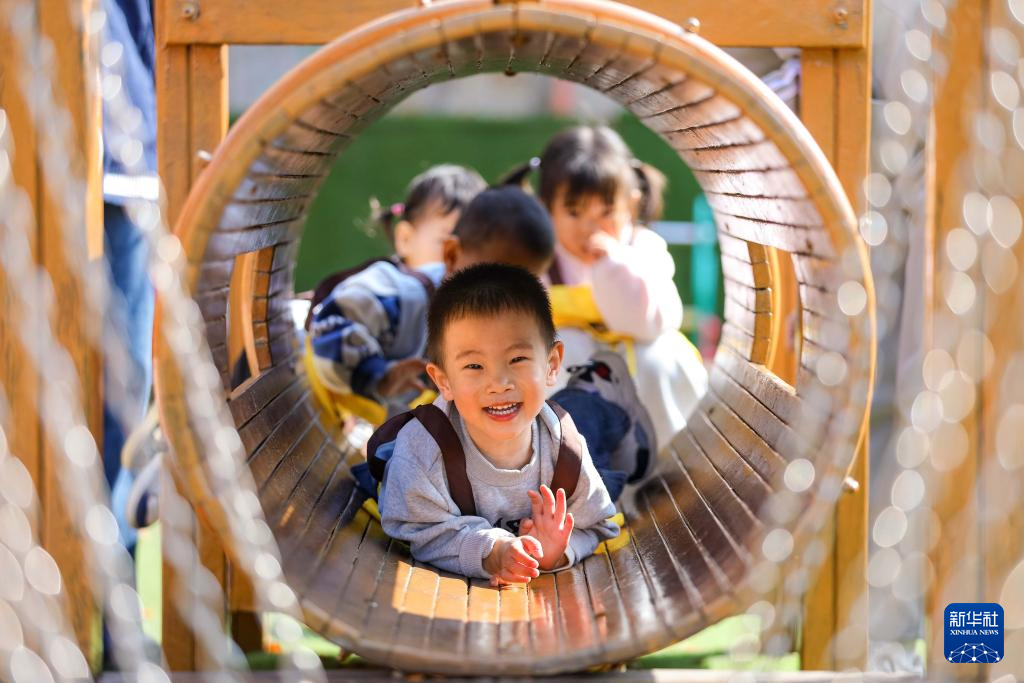 11月4日,在山東青島恒星科技學院恒星托育中心,托育班的小朋友在游樂場玩耍。