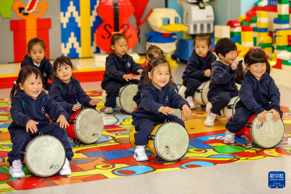 11月4日,在山東青島恒星科技學院恒星托育中心,老師教托育班的小朋友學習非洲鼓。