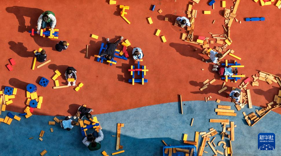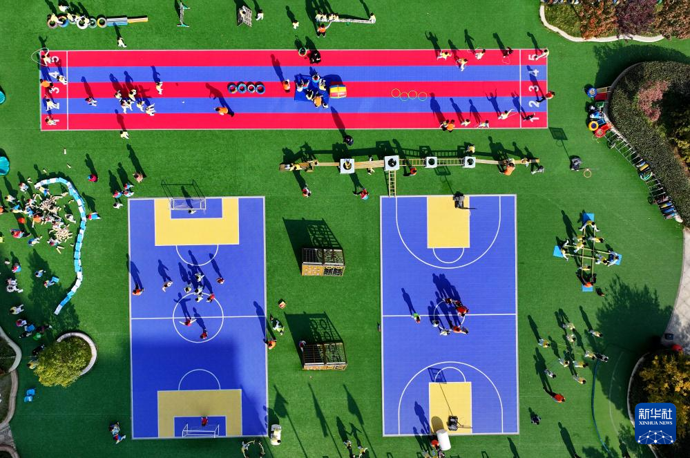 11月5日,在山東棗莊紅黃藍幼兒園,孩子們在老師的陪伴下開展戶外活動(無人機照片)。