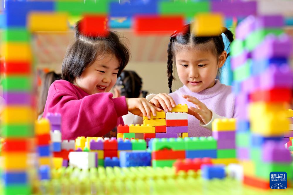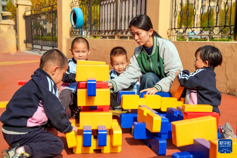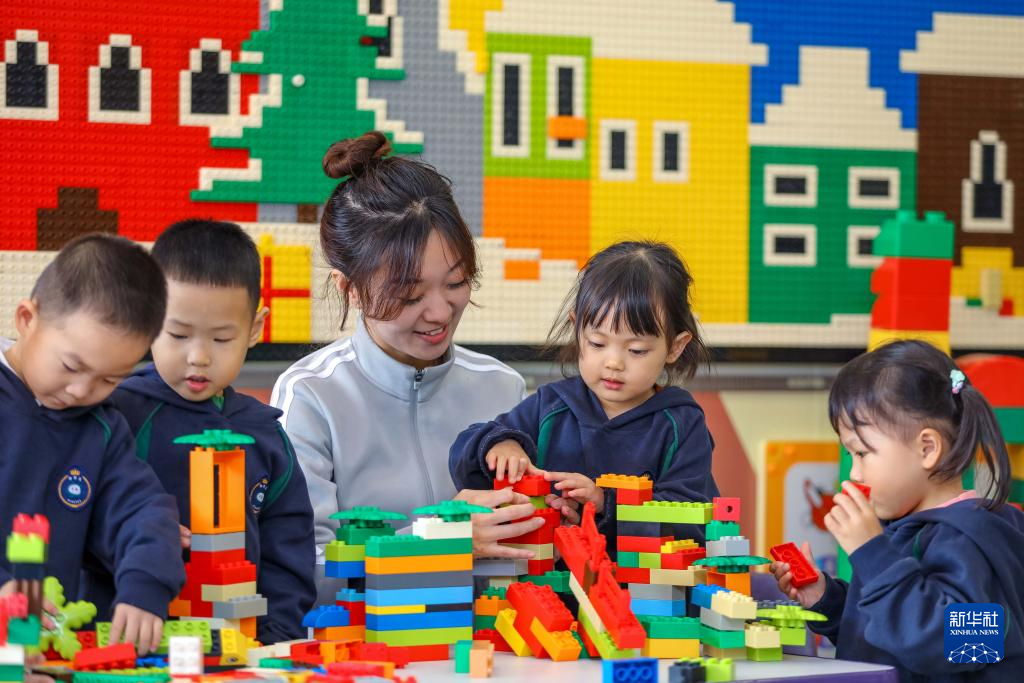 11月6日,在山東省棗莊市市中區西王莊鎮中心幼兒園,托育班的小朋友在拼搭積木。