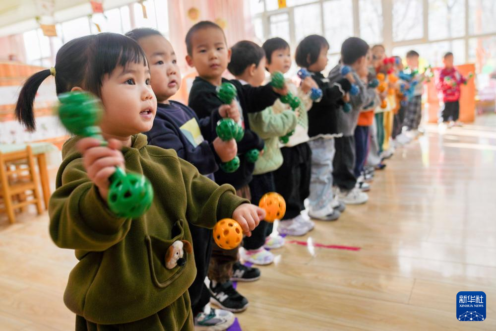 11月6日,在山東省鄒平市黃山實驗幼兒園,托育班的小朋友在做搖鈴操。