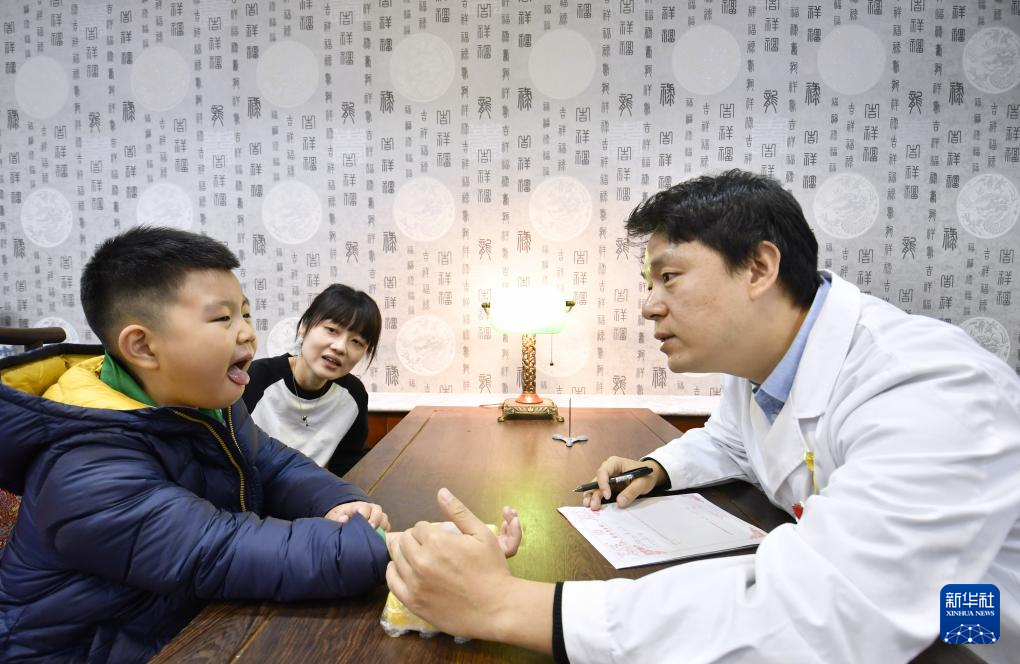 11月13日,同仁堂中醫館中醫專家郝鵬(右)為小患者診病。