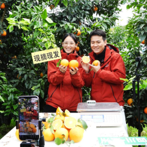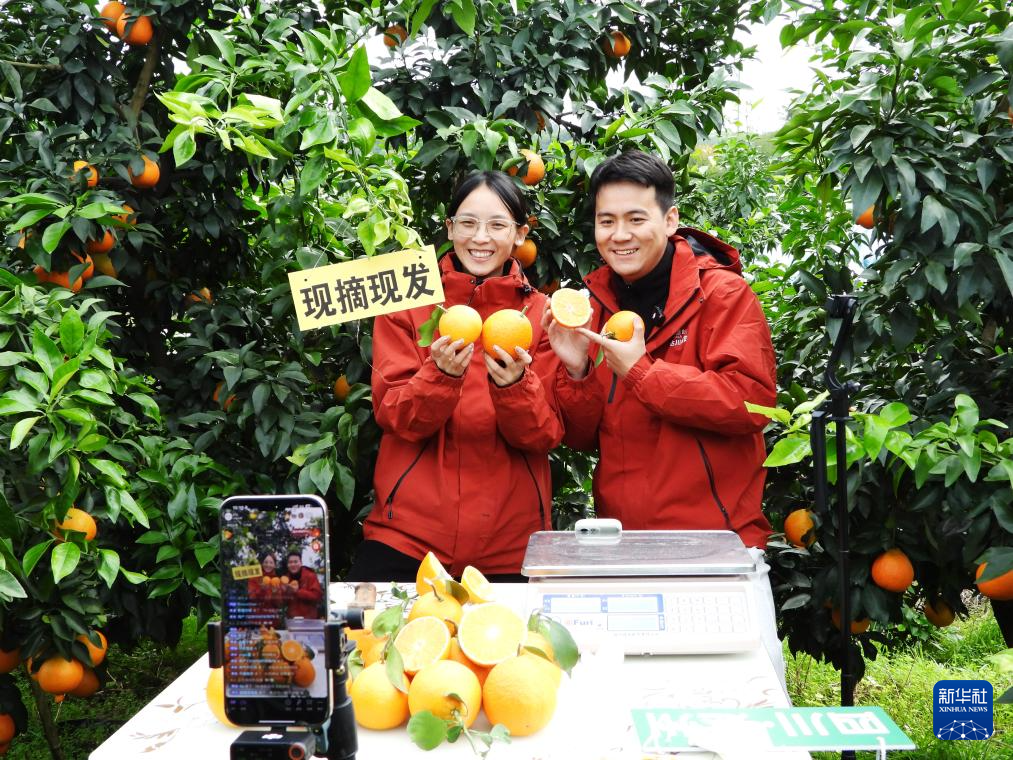 11月18日,在四川省達州市渠縣合力鎮石燕村柑桔種植基地,工作人員線上直播銷售臍橙。