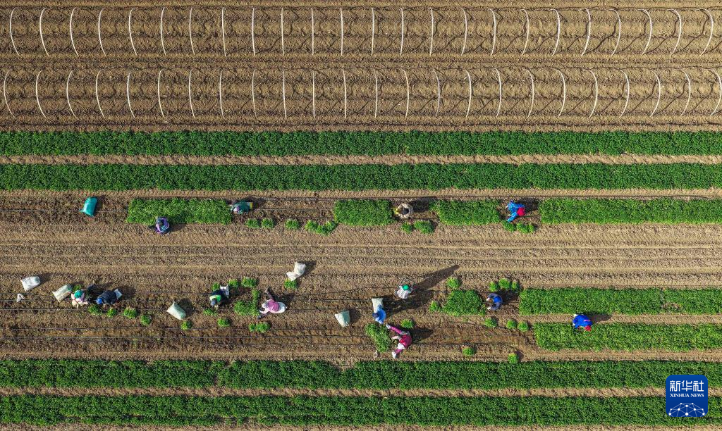 11月18日,河北省唐山市玉田縣虹橋鎮農民在田間收獲香菜(無人機照片)。