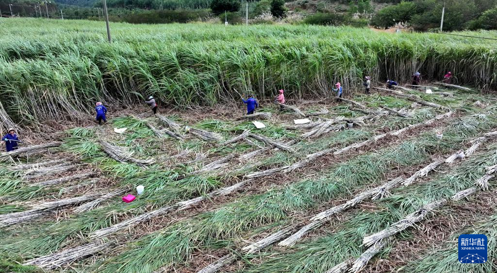 11月18日,在廣西壯族自治區柳州市柳城縣龍頭鎮,蔗農在地里砍收甘蔗(無人機照片)。
