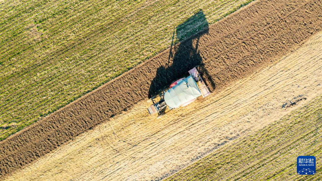 11月19日,河南省商丘市睢縣周堂鎮齊莊村農機手駕駛農機整備農田(無人機照片)。