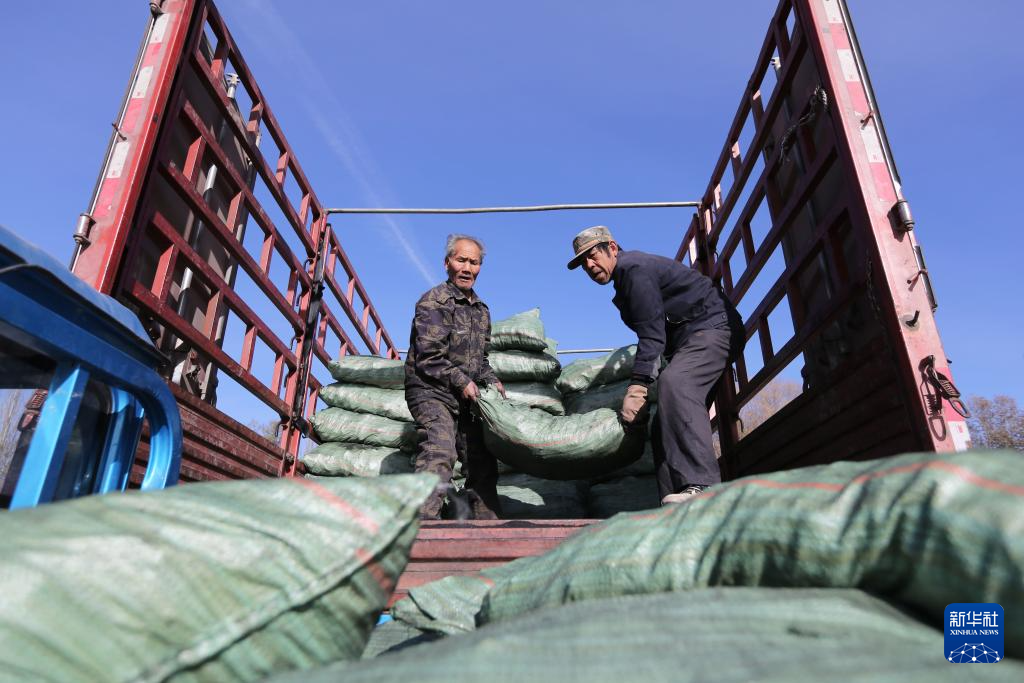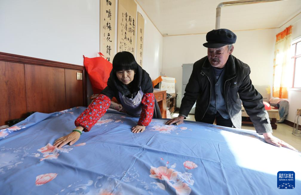 11月19日,甘肅省定西市安定區內官營鎮先鋒村村民在整理剛領到的新床單。