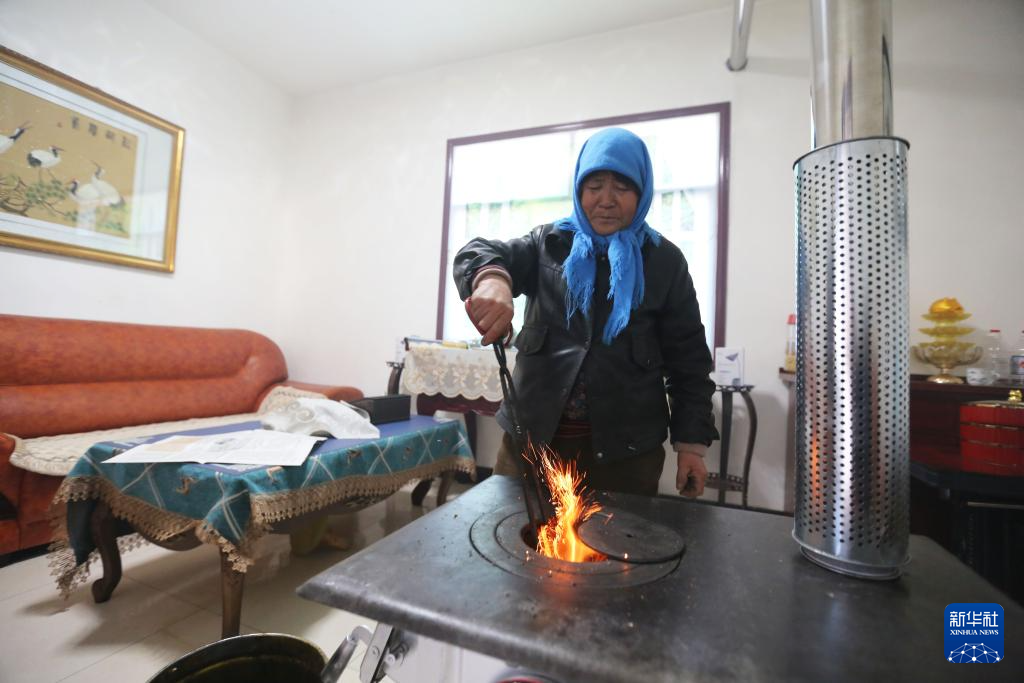 11月18日,在甘肅省定西市安定區鳳翔鎮中川村,剛領到新煤爐和取暖用煤的村民生火取暖。
